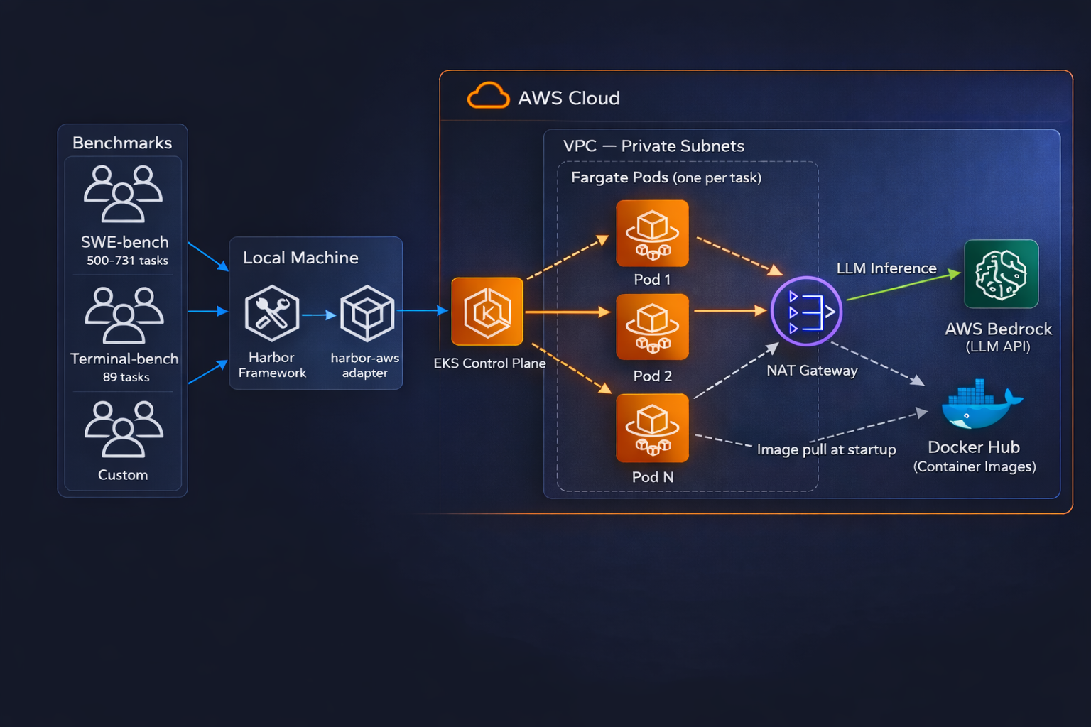 Harbor-AWS is an execution backend for Harbor that runs benchmark tasks as ephemeral pods on EKS Fargate. It targets workloads such as SWE-bench and Terminal-bench, where runs consist of many mostly independent tasks and where each task benefits from an isolated execution environment. The design emphasizes simple infrastructure lifecycle management, pay-on-demand compute, and high task-level parallelism.